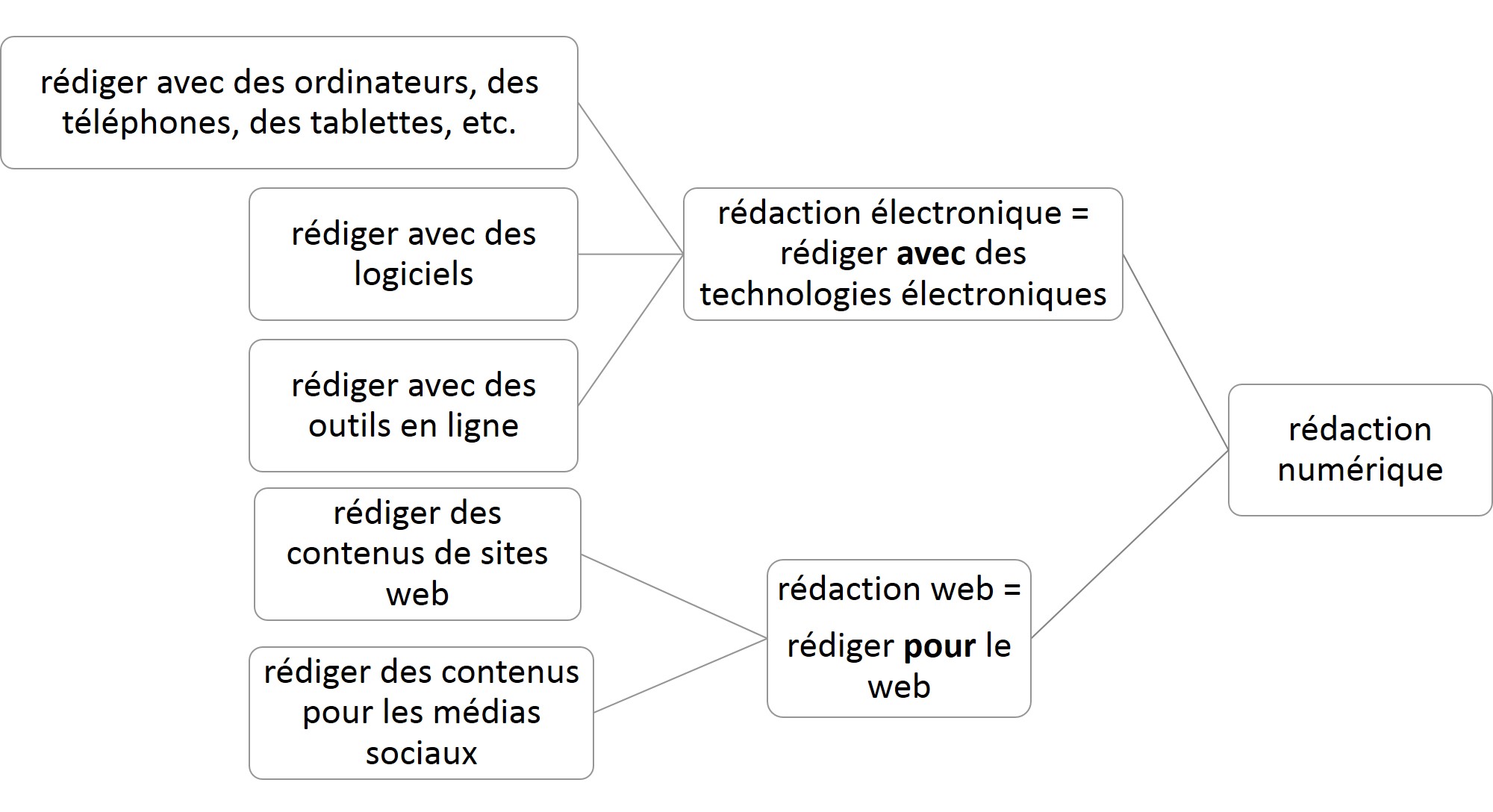 Mireille Auger me confiait en entrevue que la transition entre les deux genres de textes n’est pas toujours facile. D’un point de vue théorique, ce défi s’explique facilement. Prenons ce magnifique croquis, censé représenter le spectre de la rédaction professionnelle.